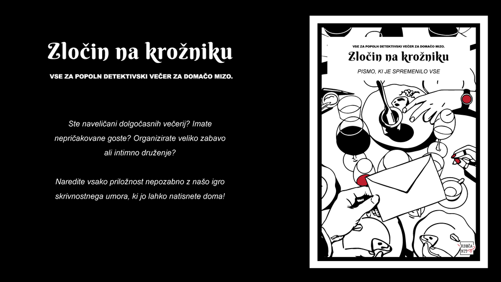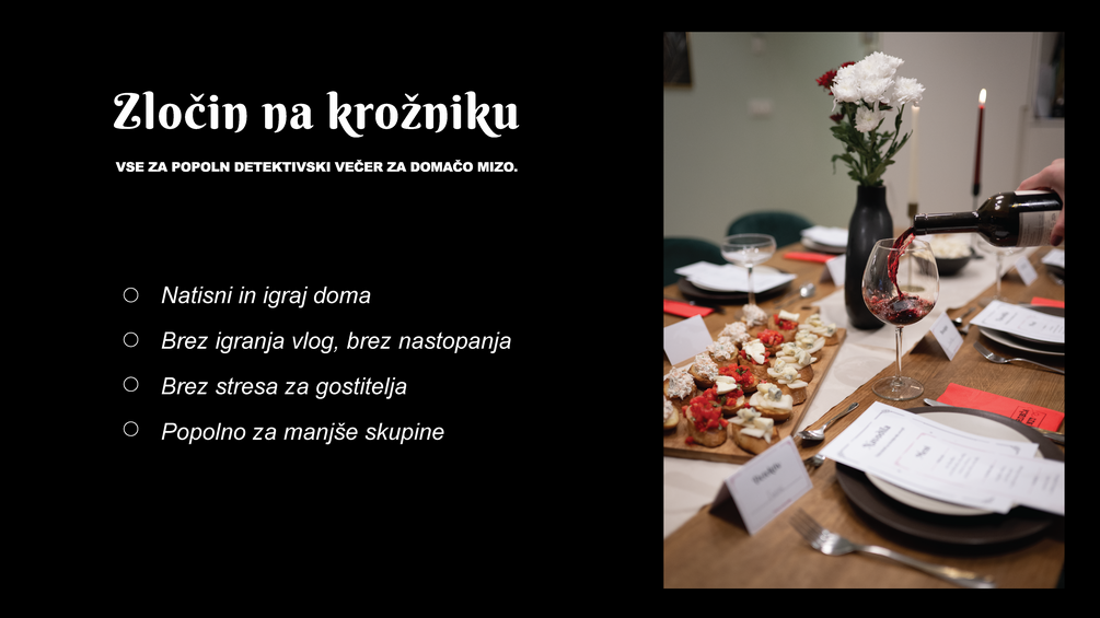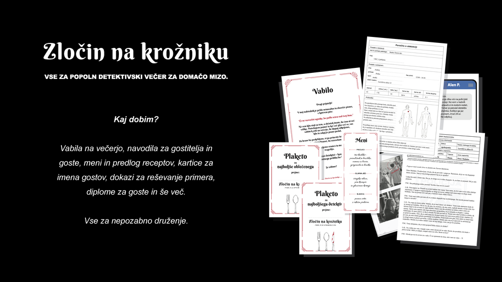 Kaj dobim? Vabila na večerjo, navodila za gostitelja in goste, meni in predlog receptov, kartice za imena gostov, dokazi za reševanje primera, diplome za goste,...
